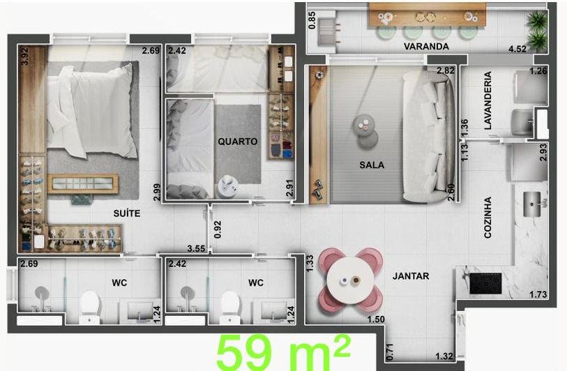 Unidades 59m²: 2 dorms, suíte, varanda, vaga livre e coberta