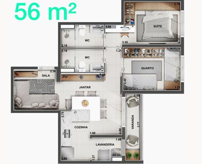 Unidades 56m²: 2 dorms, suíte, varanda, vaga livre e coberta