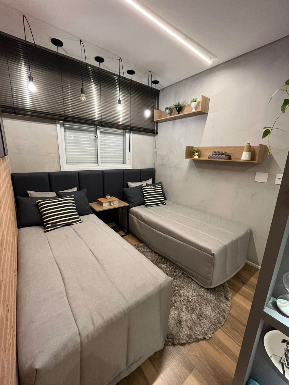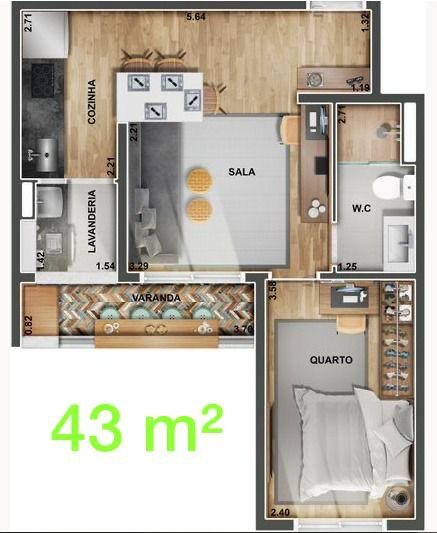 Unidades 43m²: 1 dorm, varanda, vaga livre e coberta